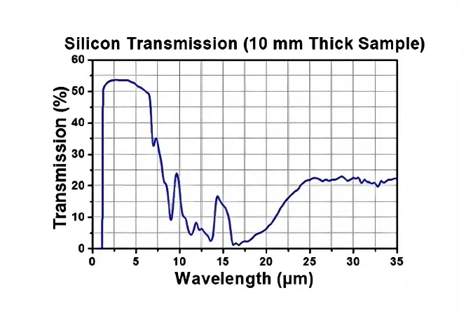 单晶硅是一种综合性价比优异的红外光学材料。作为一种透射级材料,光学级直拉硅(OCZ-Si)被广泛应用于中红外 (3-5um) 波段,其红外透射率超过50%。区熔单晶硅可应用于更宽广的波段(1-14um),而高纯度区熔单晶硅(HPFZ-Si)甚至可应用于远红外波段(大于30um)。